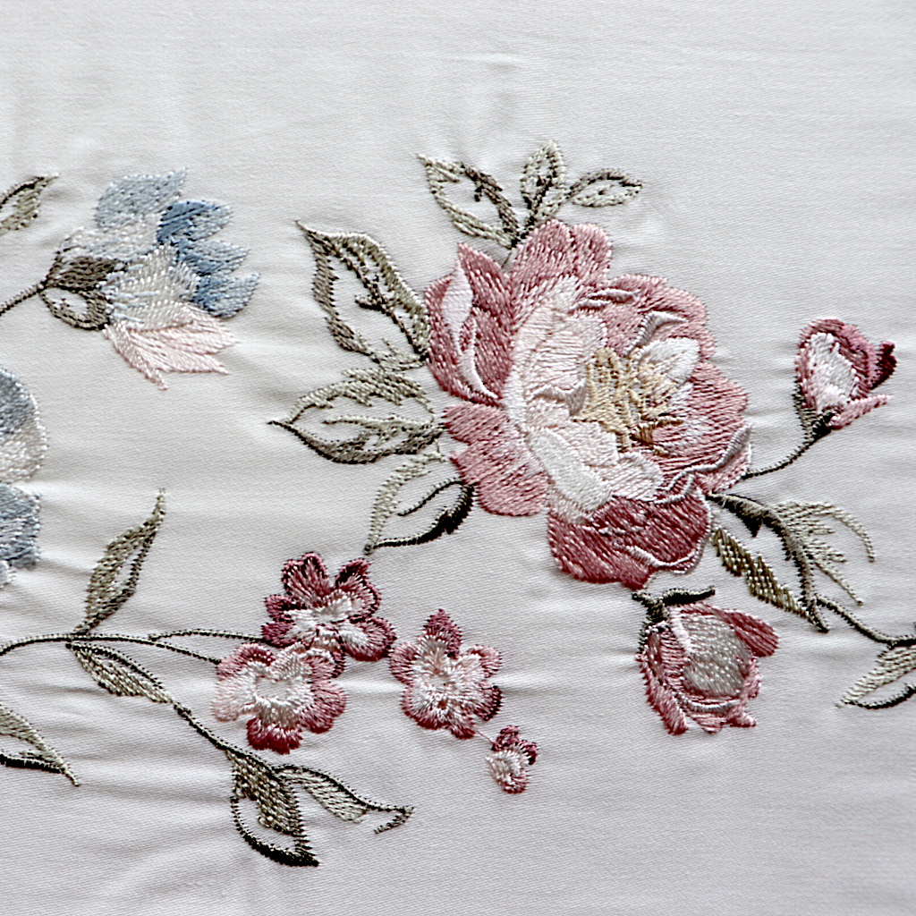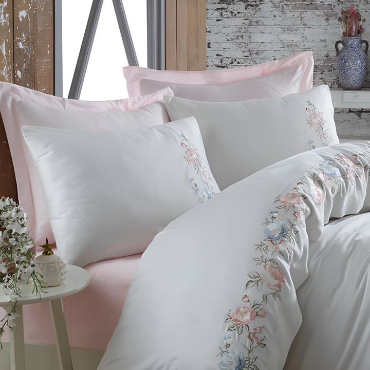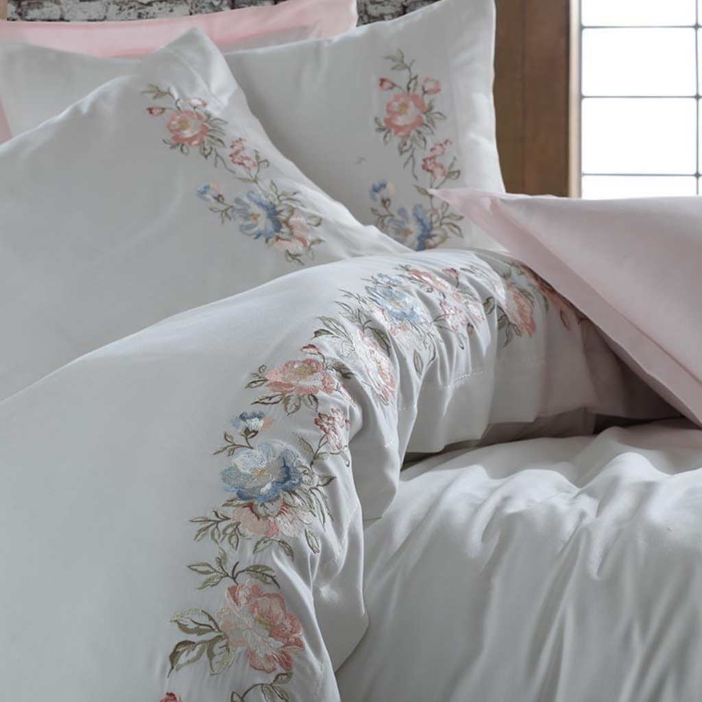 Fethiye duvet cover and pillowcases bring delicate elegance to your bedroom with its soft floral embroidery in shades of pink, blue, and green. The powder pink bedsheet and plain pillowcases add a romantic and serene touch, while the embroidered pillowcases and duvet cover offer a refined, graceful look. Made from high-quality cotton-sateen, this set combines a velvety smooth texture with long-lasting durability. Perfect for those who appreciate both comfort and timeless design, Fethiye transforms your bedroom into a peaceful and inviting space.