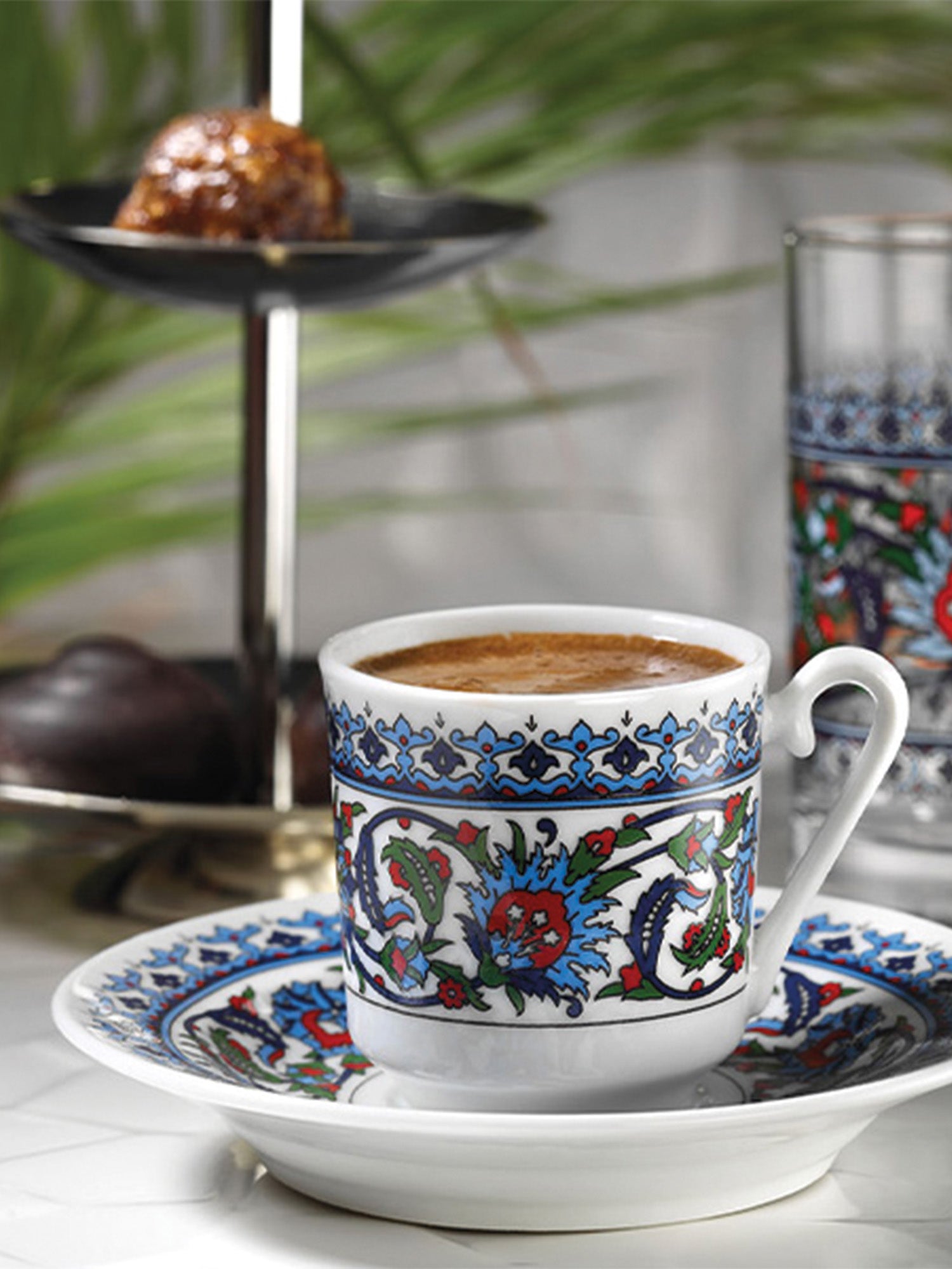 В этот набор входят фарфоровые чашки с замысловатым дизайном, декоративное блюдце и медный кофейник (джезва) ручной работы, воплощающий богатое наследие турецкой кофейной культуры. Он идеально подходит для особых случаев или в качестве уникального подарка, привнося в ваши кофейные ритуалы как традицию, так и элегантность.